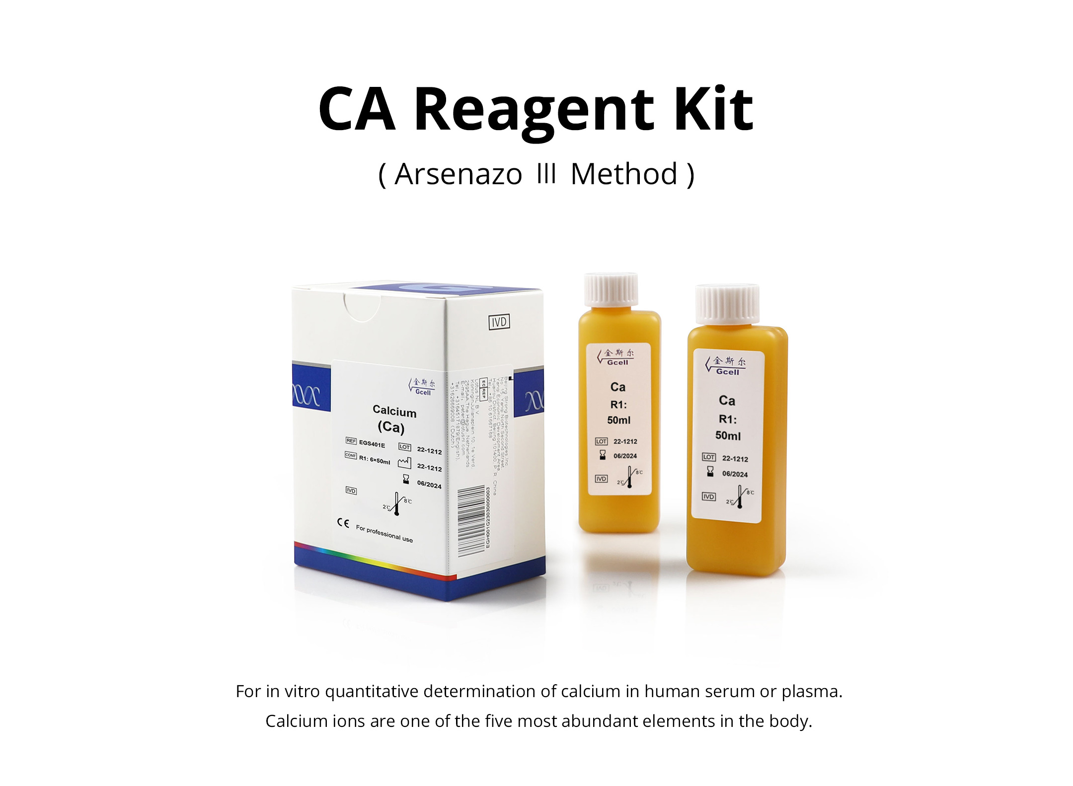 For in vitro quantitative determination of calcium in human serum or plasma. Calcium ions are one of the five most abundant elements in the body.