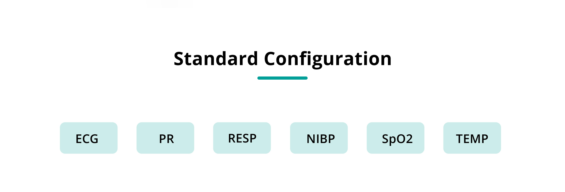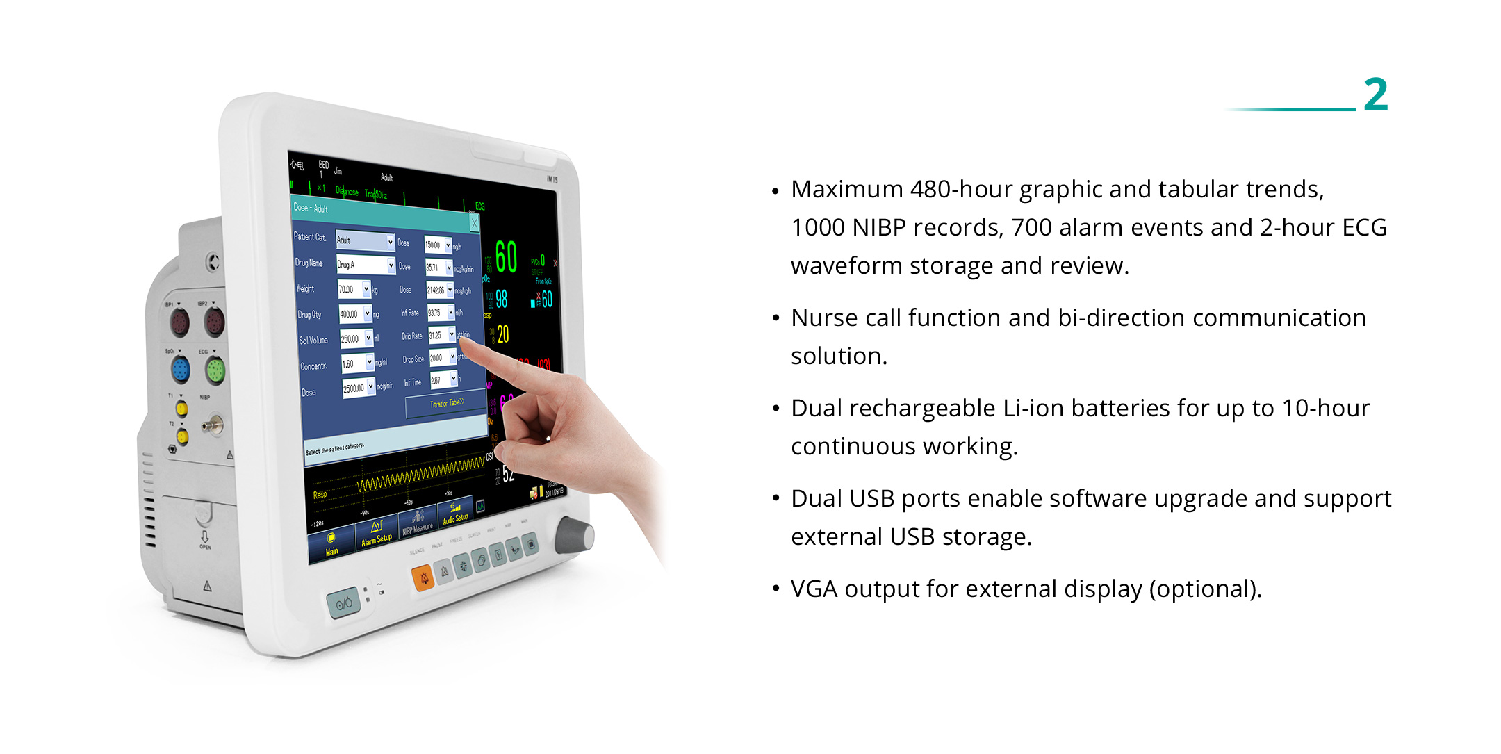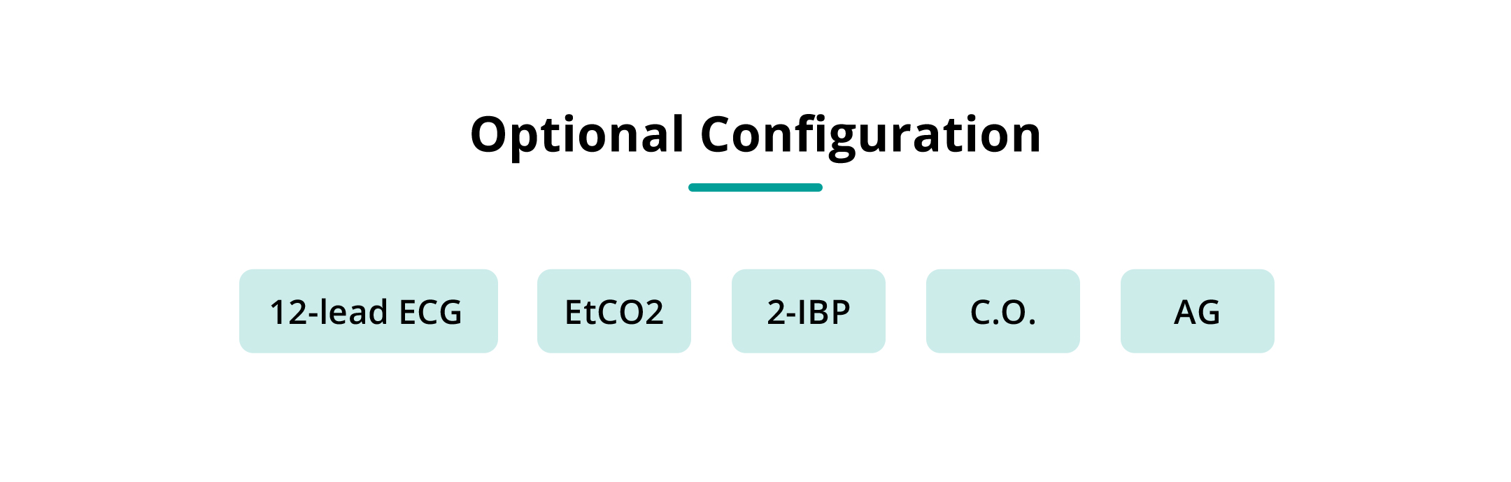 PR from SpO2 module: range: 30 bpm ~ 250 bpm, resolution: 1 bpm, measuring tolerance: ± 2 bpm, average time: 8 s |