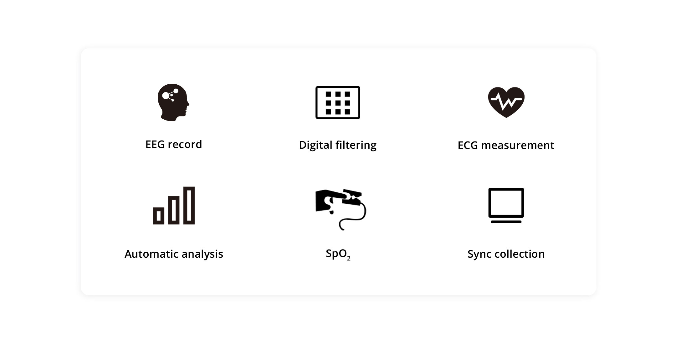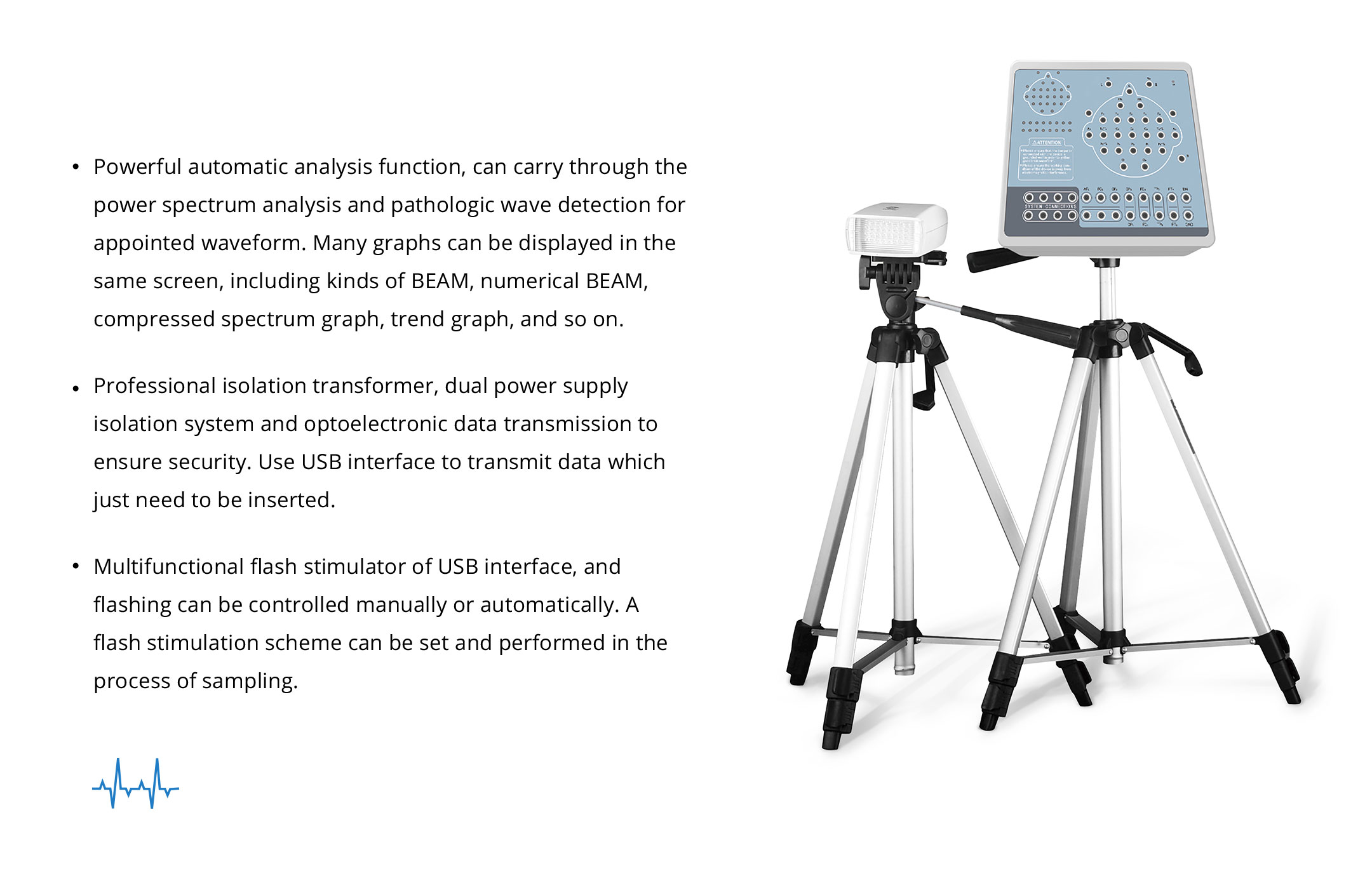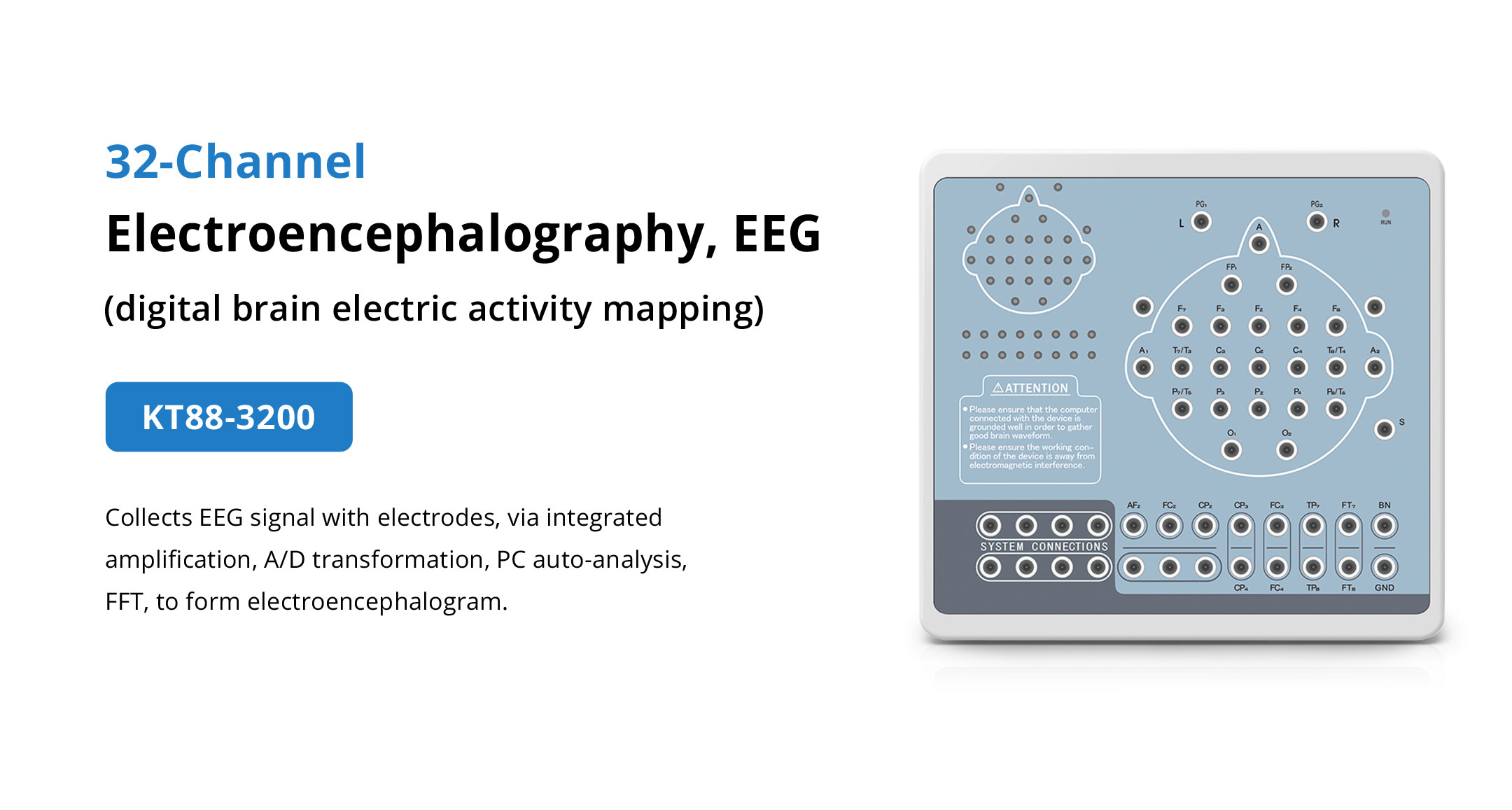 Collects EEG signal with electrodes, via integrated amplification, A/D transformation, PC auto-analysis, FFT, to form electroencephalogram.
