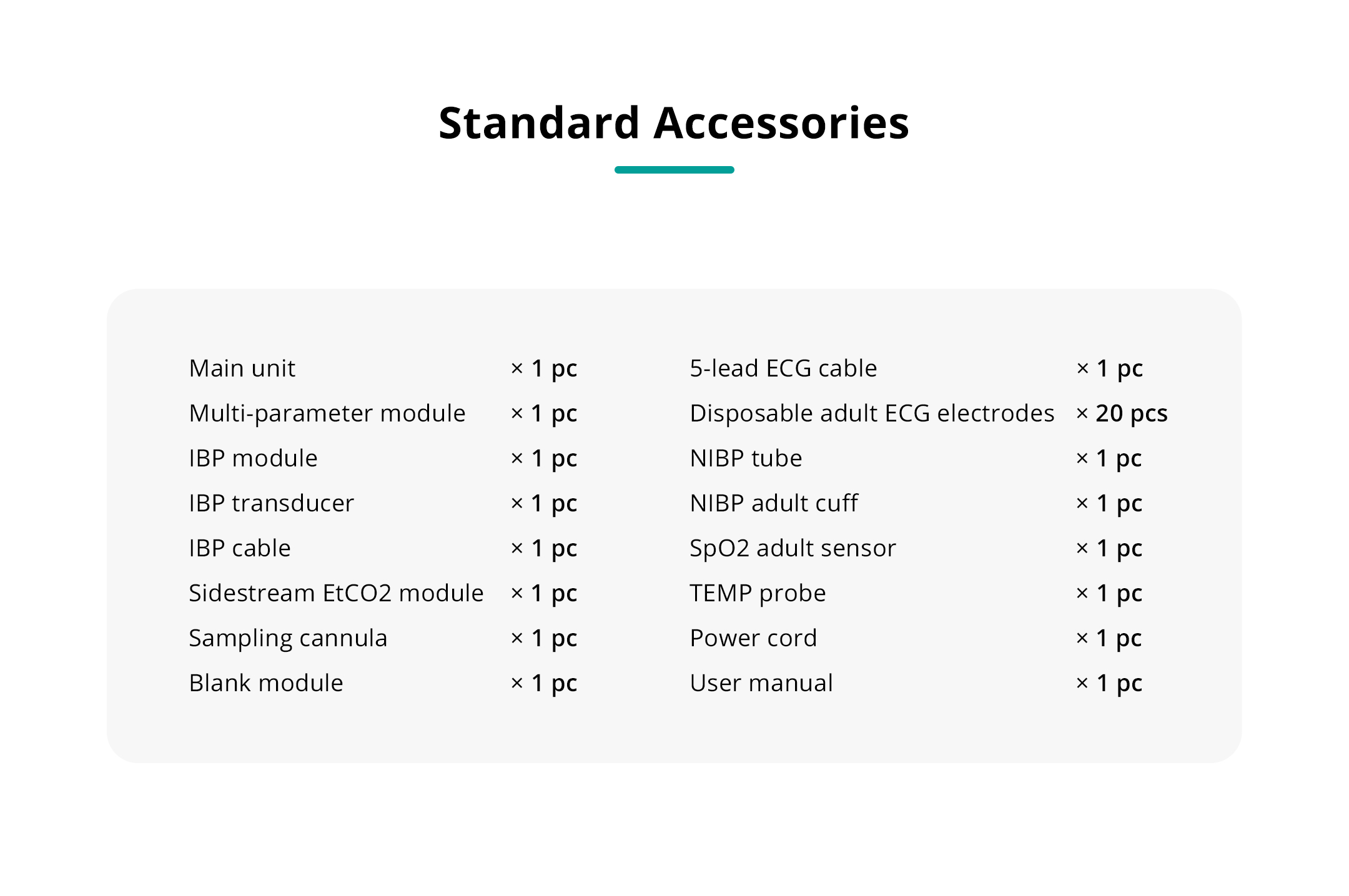 Respiration rate: measurement and alarm range: 0 ~ 150 rpm resolution: 1 rpm accuracy: 7 ~ 150 rpm, ± 2 rpm or ± 2 %, whichever is greater; 0 ~ 6 rpm, unspecified |