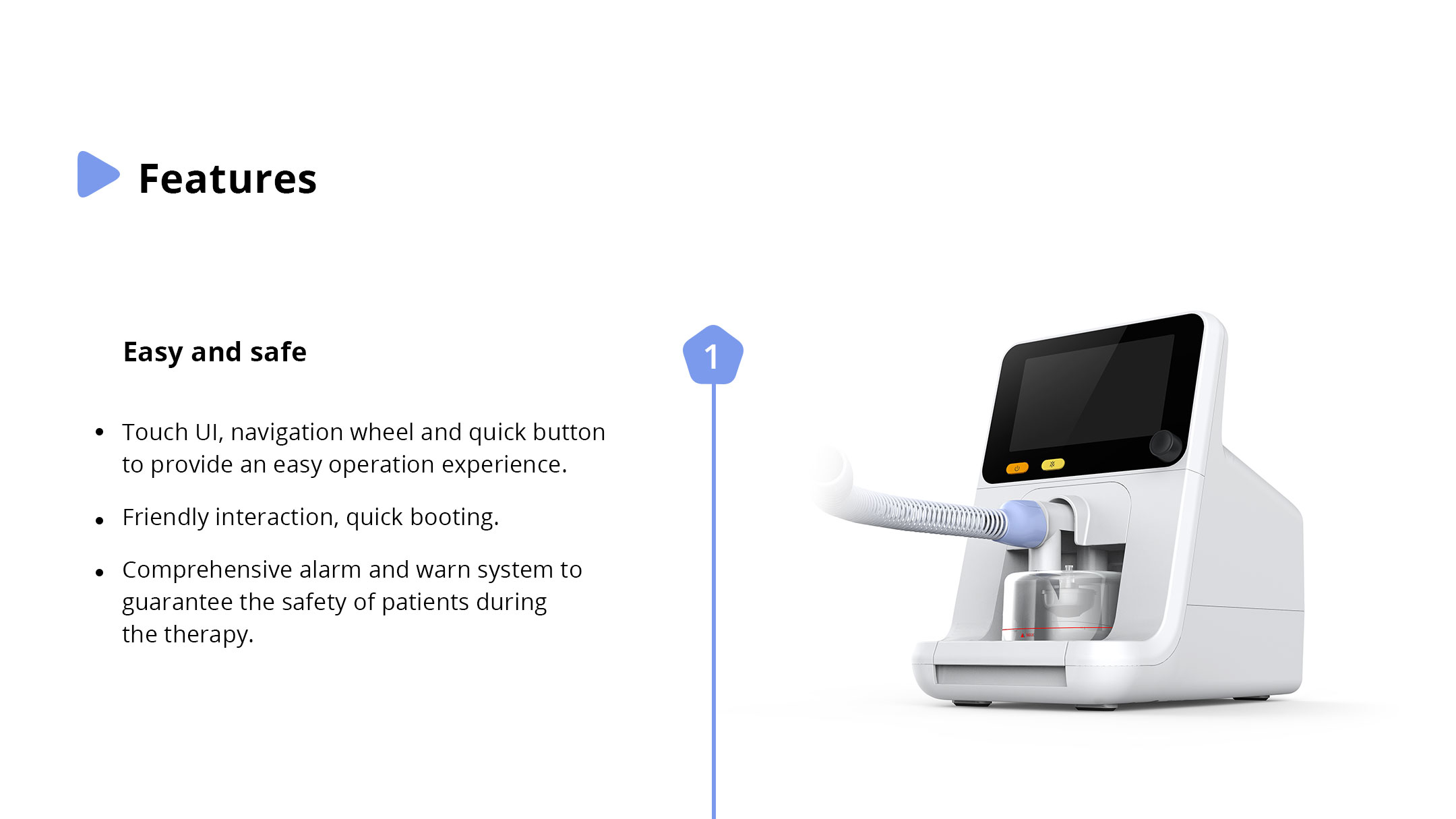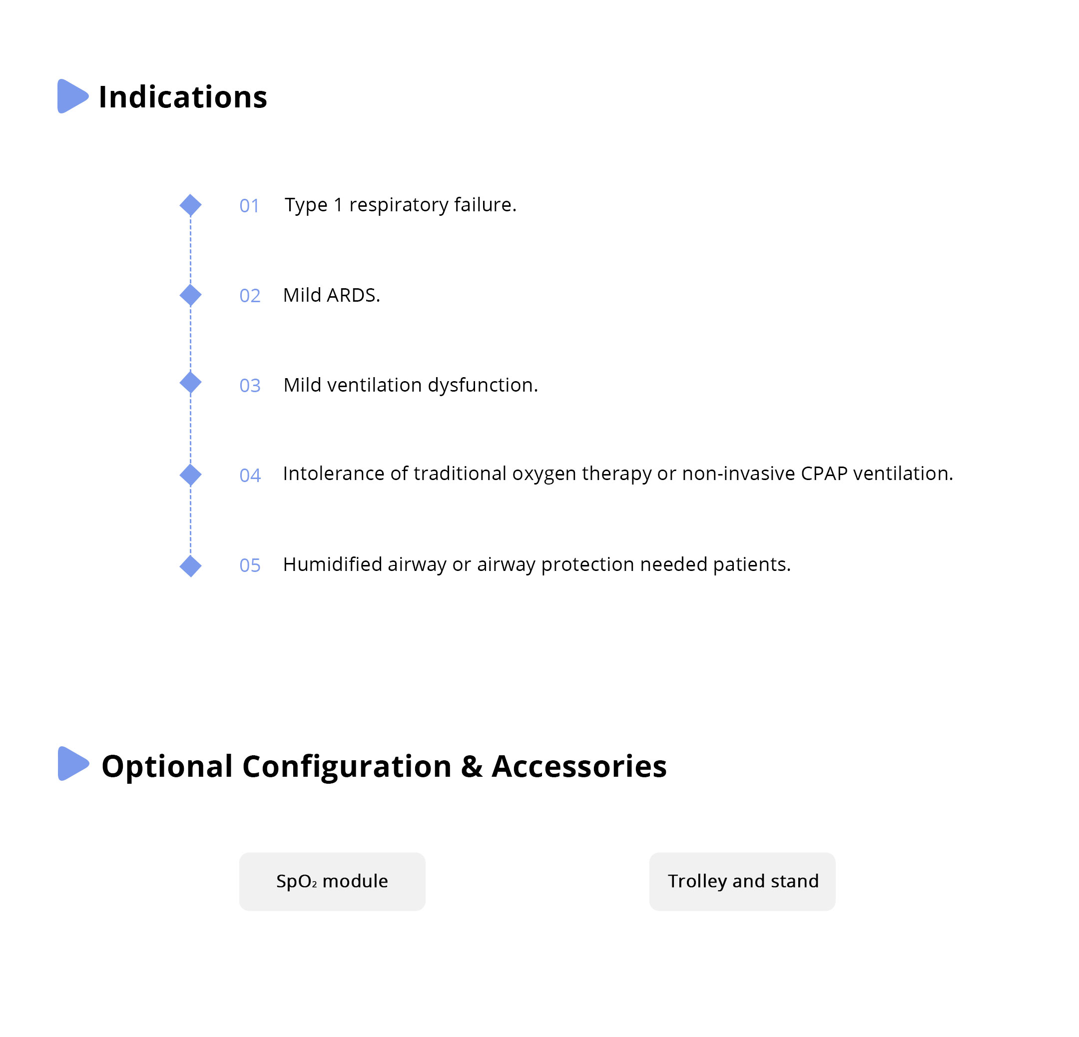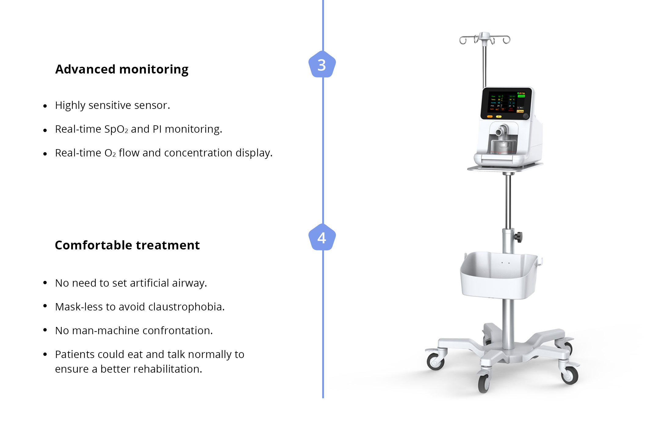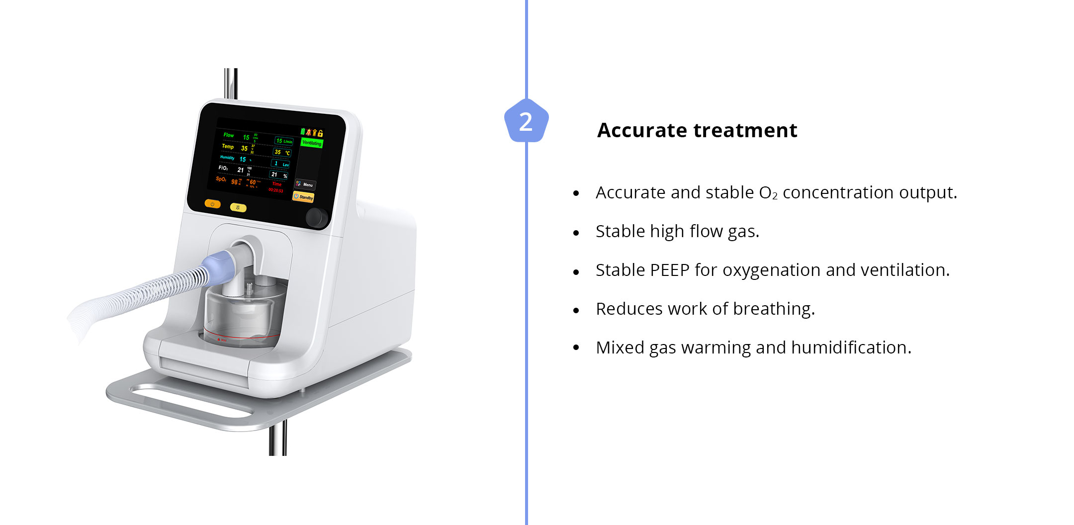 It is a high flow nasal cannula oxygen therapy device, capable of delivering a mixed oxygen with an easy controlled temperature and humidity.