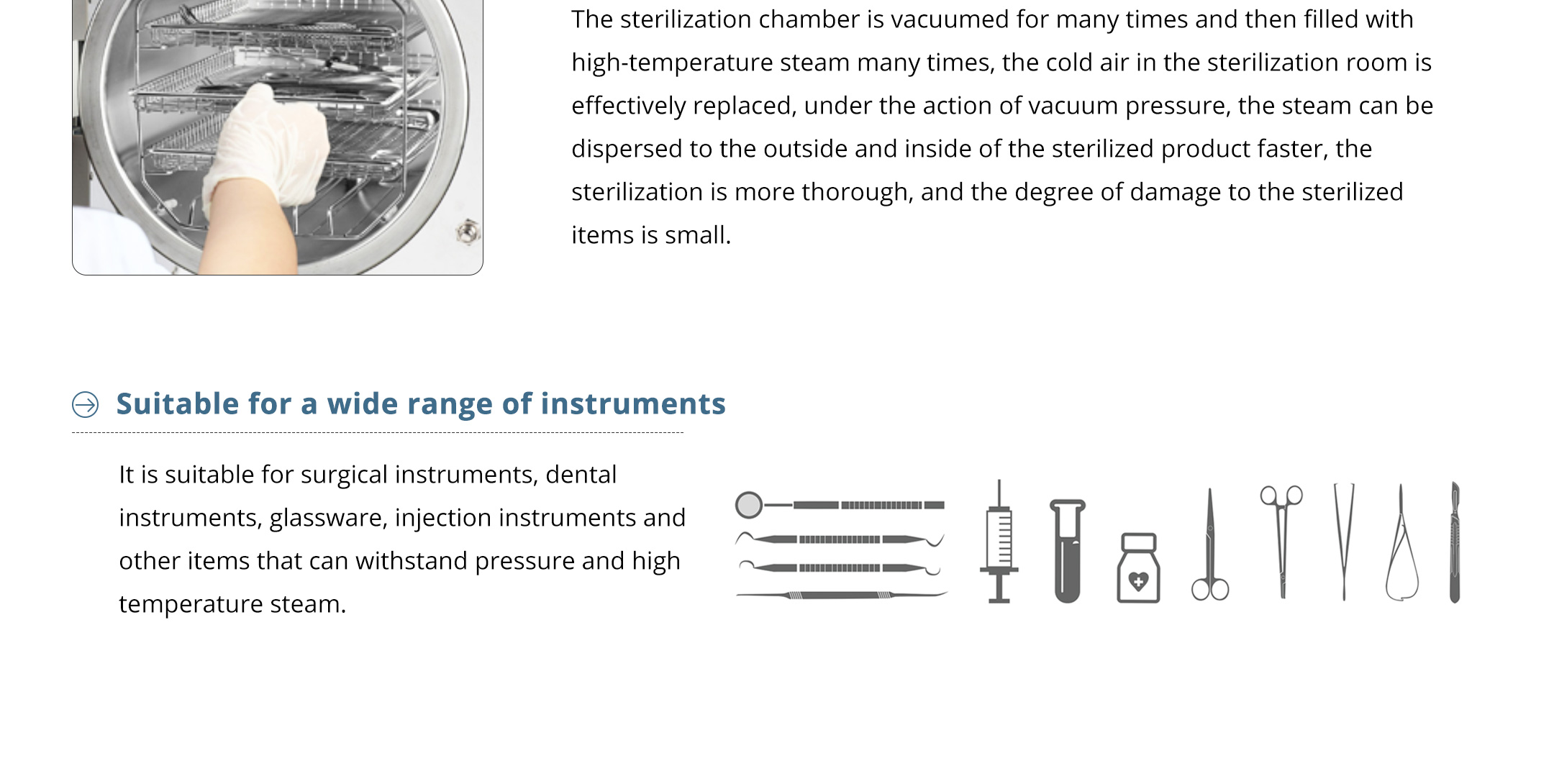 It is suitable for sterilization of surgical instruments, medical excipients, utensils and other items.