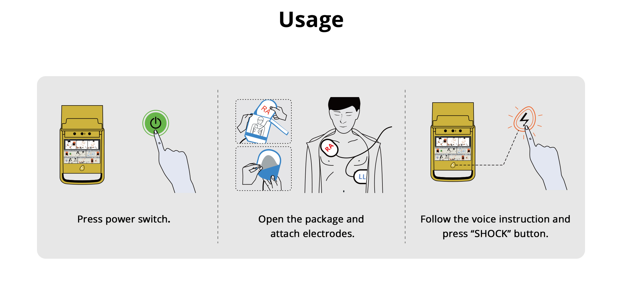 Voice prompt “Press flashing orange button for shock immediately”.