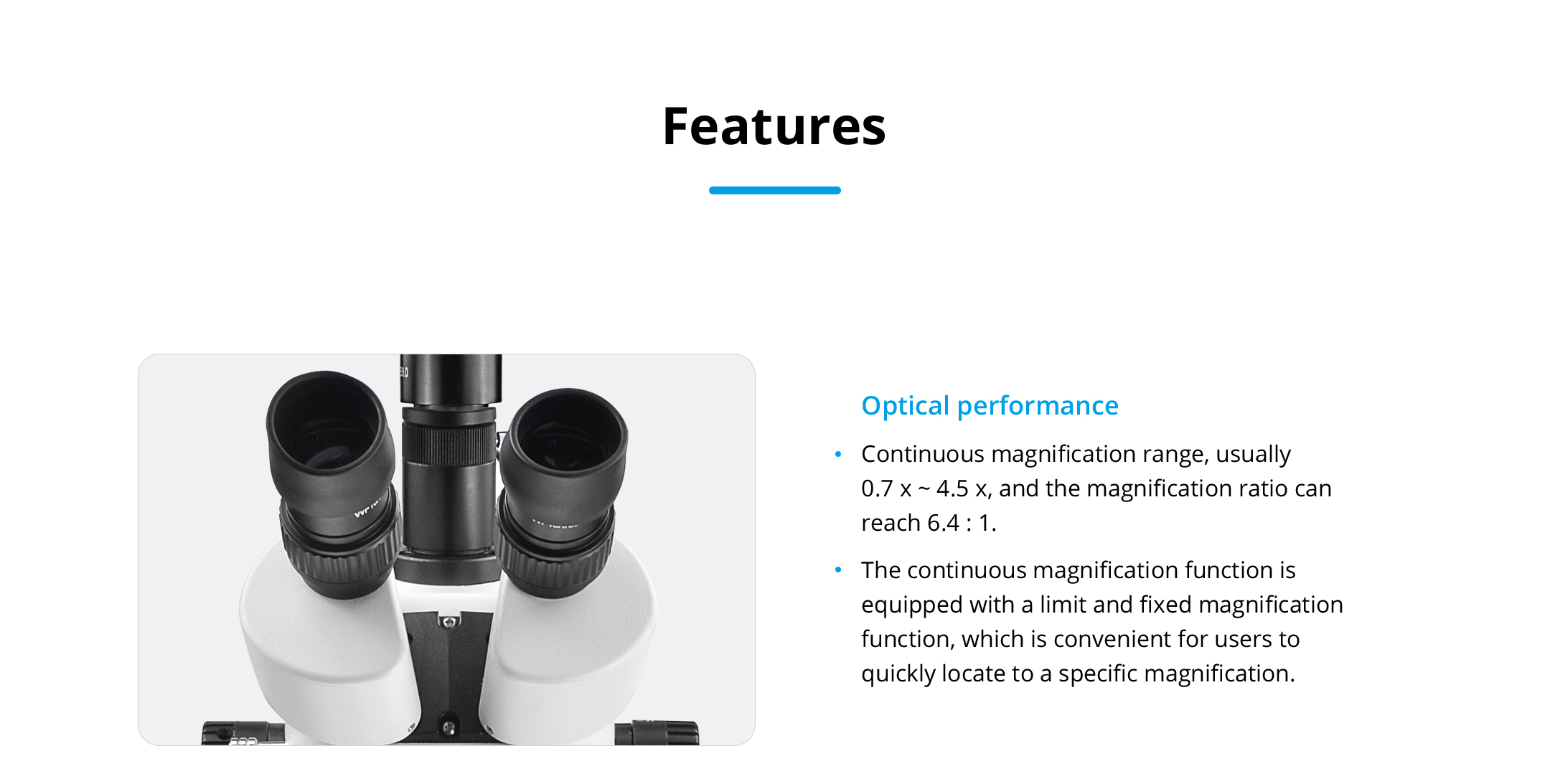 Standard configuration: 7 X ~ 45 X; Optional auxiliary objective: 3.5 X ~ 180 X |