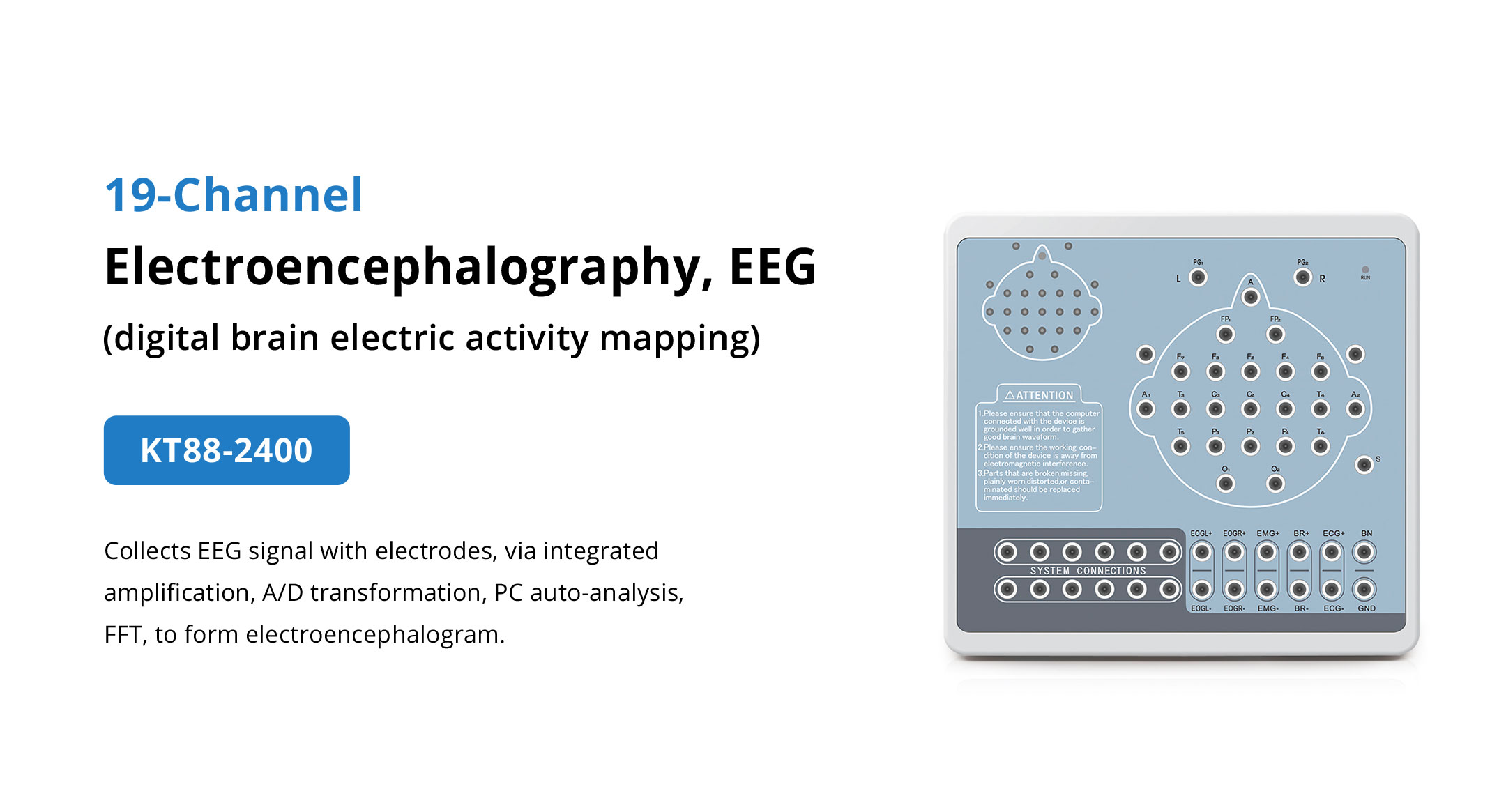 Collects EEG signal with electrodes, via integrated amplification, A/D transformation, PC auto-analysis, FFT, to form electroencephalogram.