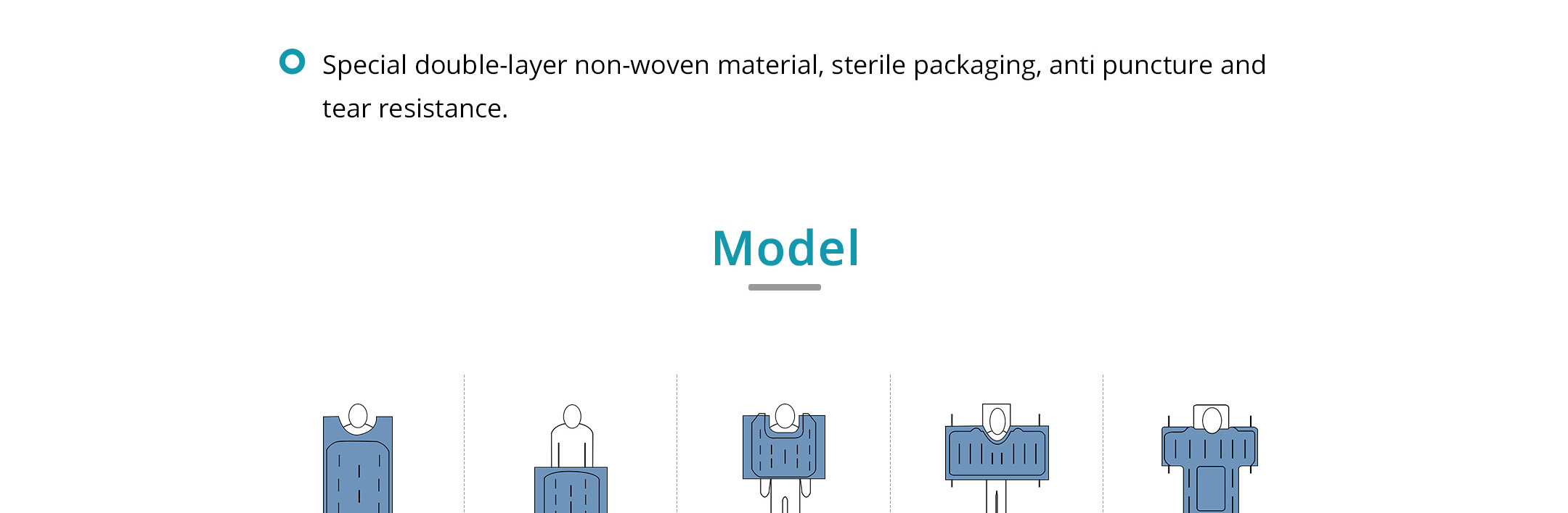 Special double-layer non-woven material, less allergic reaction, anti-puncture, anti-crack, water-proof, aseptic packaging.