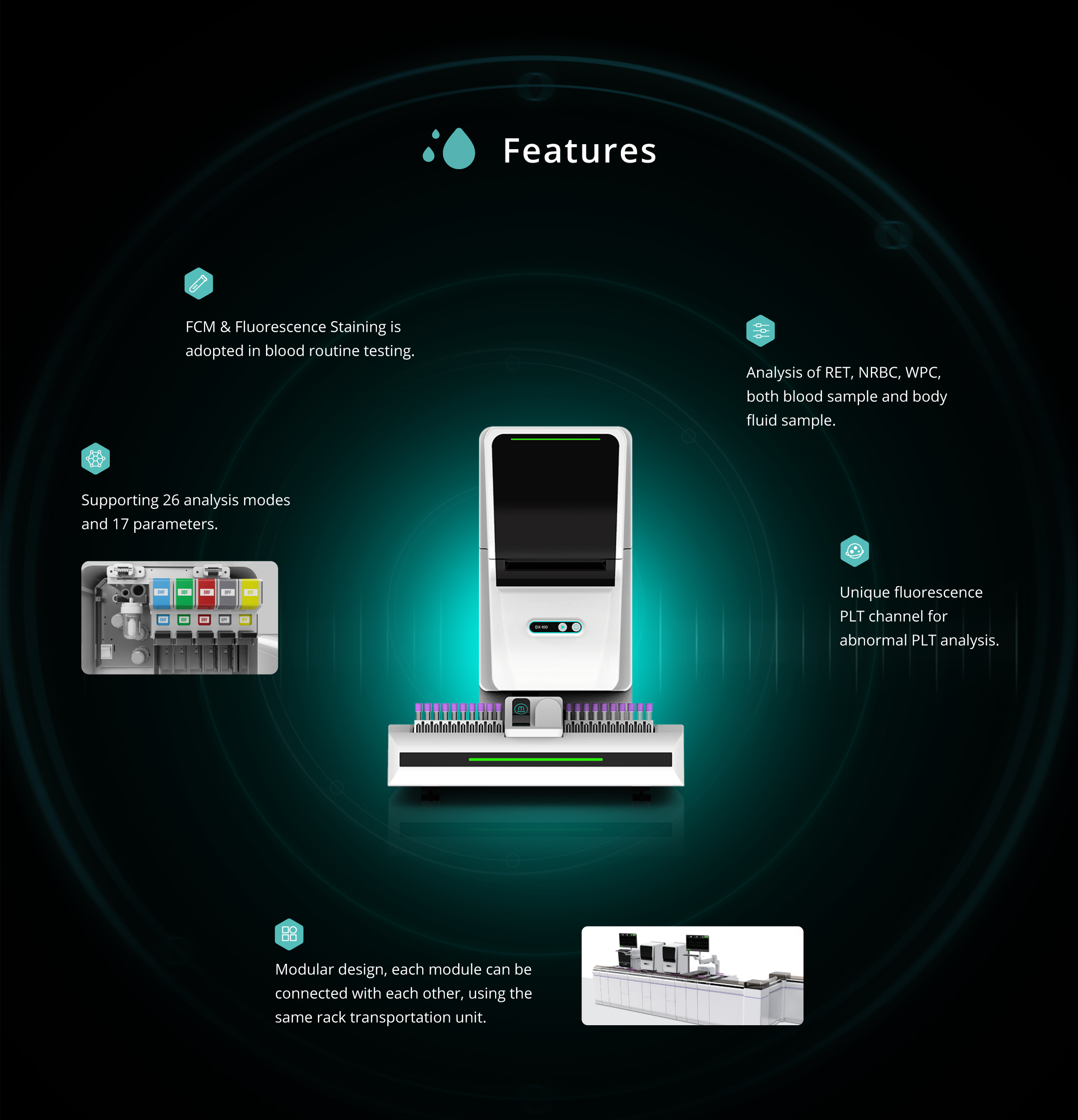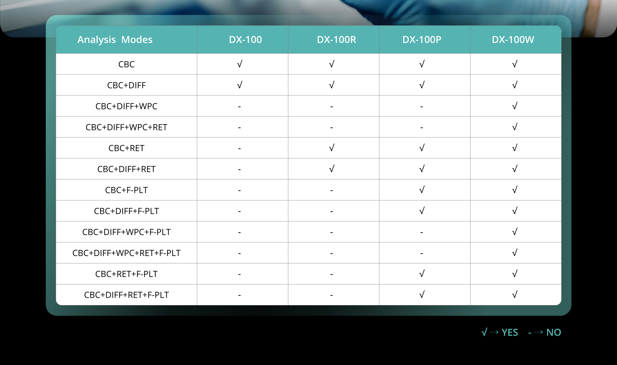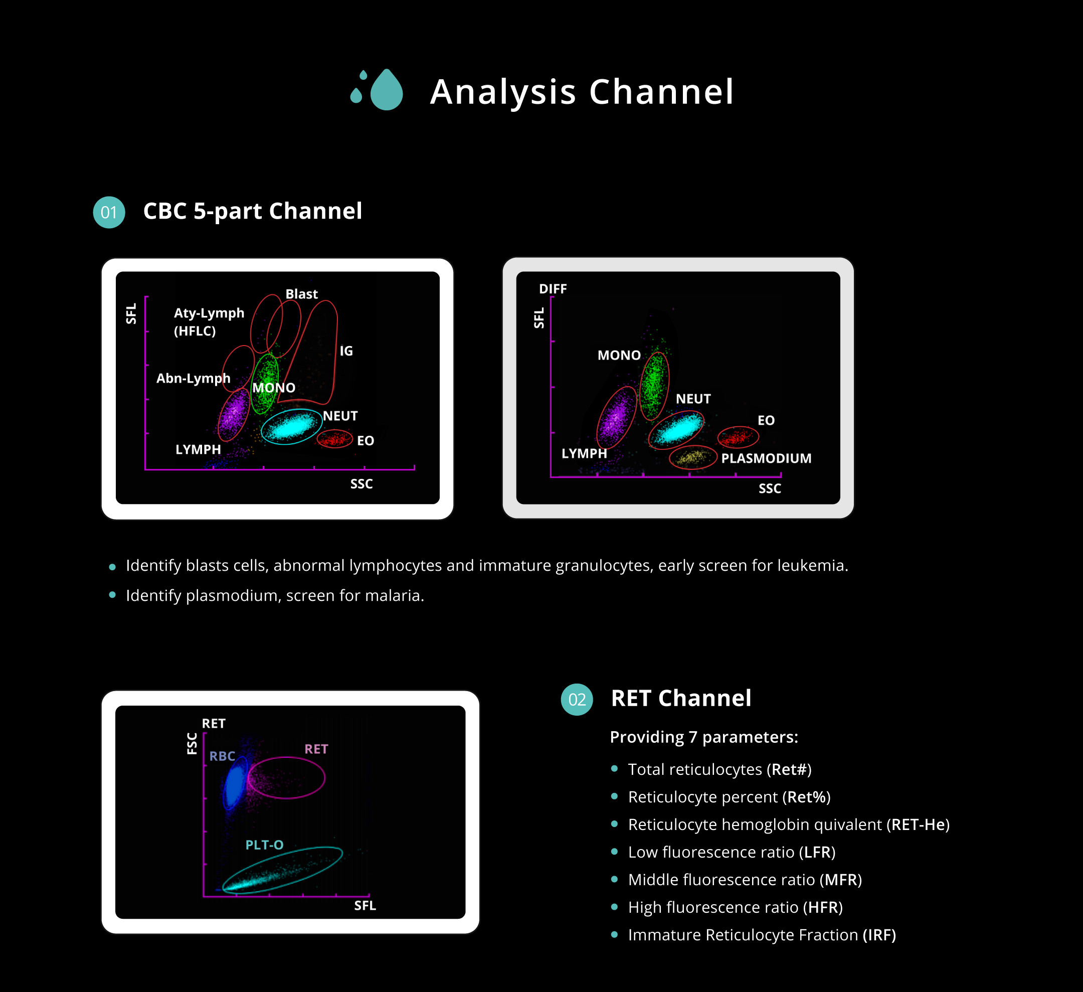 WBC, RBC, HGB, HCT, MCV, MCH, MCHC, PLT, RDW-SD, RDW-CV, PDW, MPV, P-LCC, P-LCR, PCT, NRBC#, NRBC%, NEUT#, NEUT%, LYMPH#, LYMPH%, MONO#, MONO%, EO#, EO%, BASO#, BASO%, RET#, RET%, IRF, LFR, MFR, HFR, RET-He, IPF, IG#, IG%