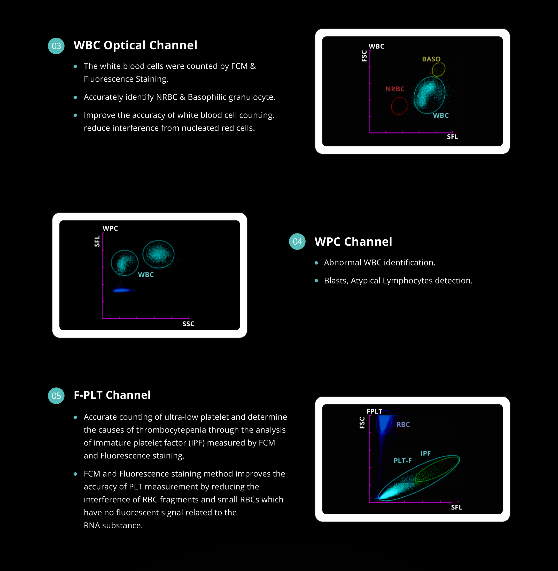 5 scattergrams (WBC/DIFF/RET/F-PLT/WPC)