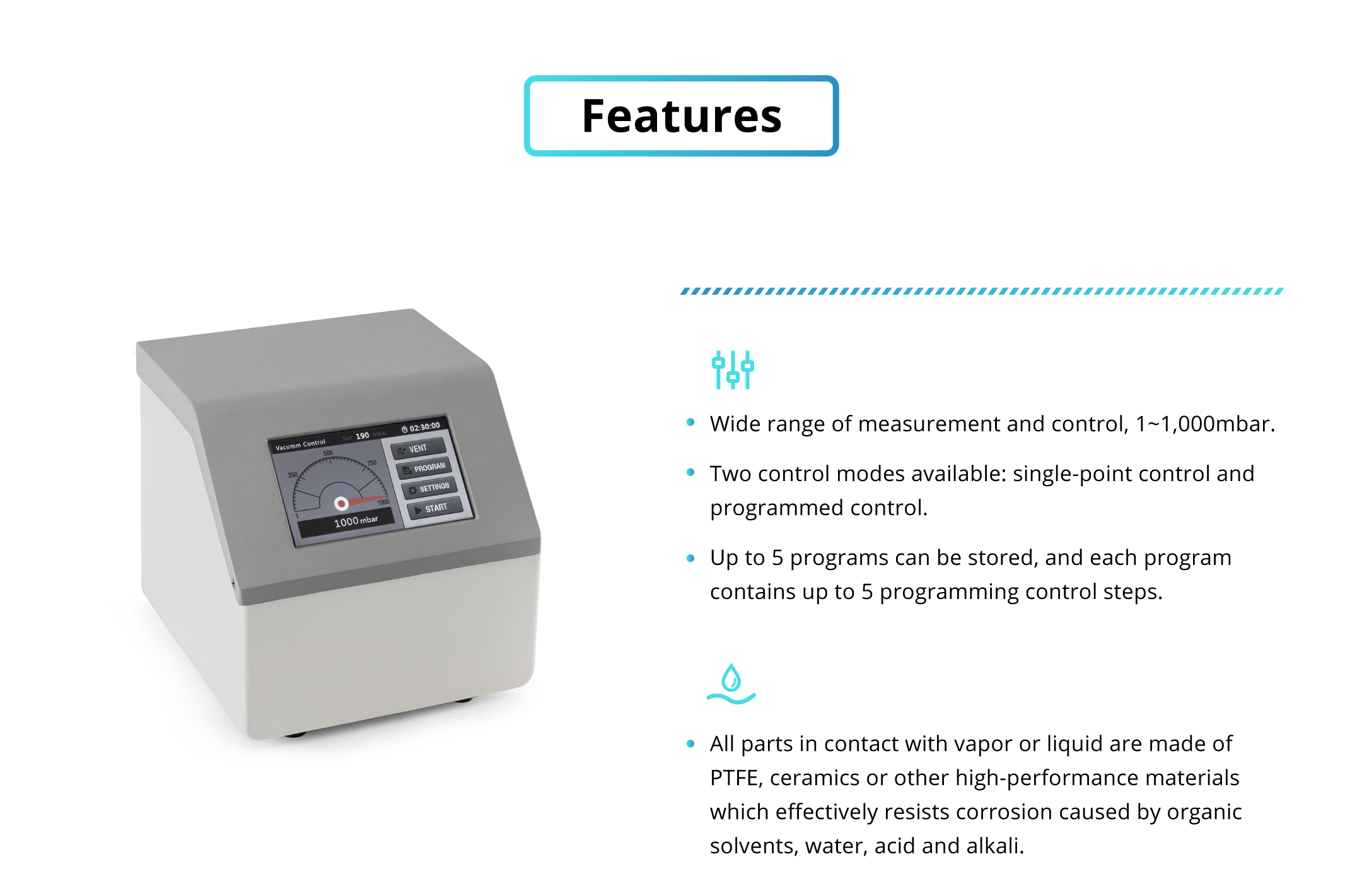 Can store up to 5 programs, each containing 5-step control (capable to set the degree of vacuum and time)