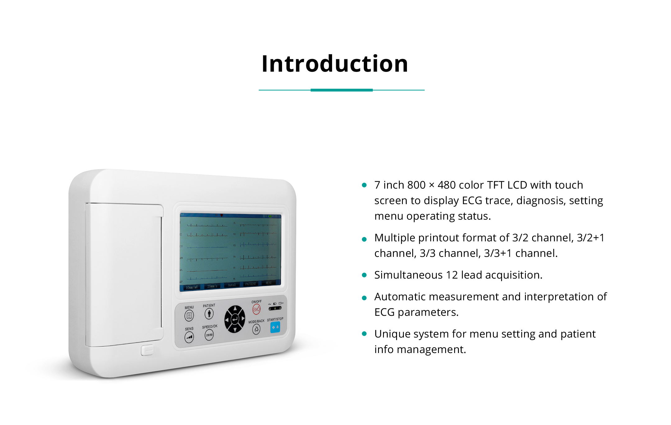 Auto 3 / 2: 3 channel (I ~ aVF), 2 channel (V1 ~ V6), automatic measurement and interpretation
