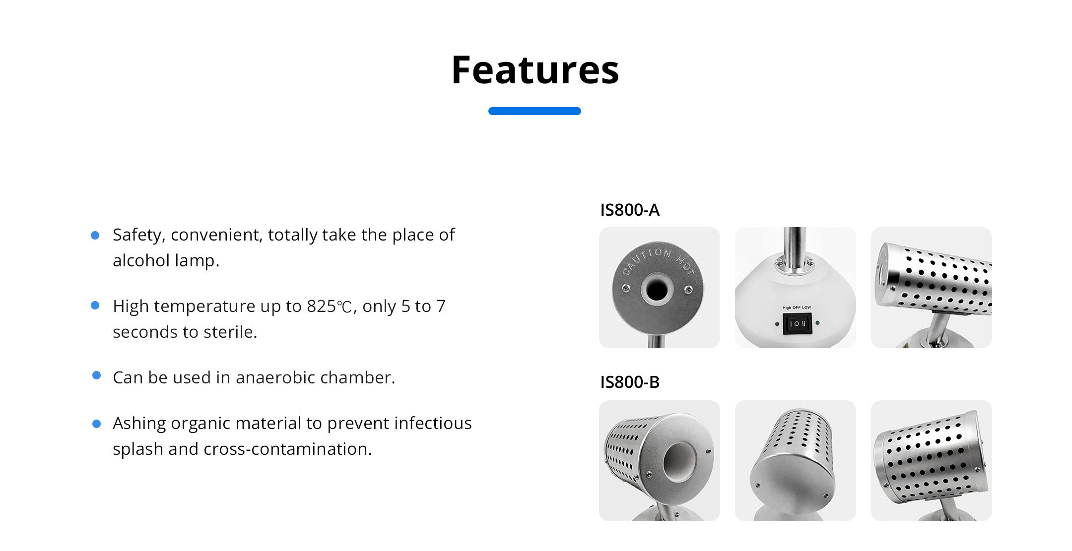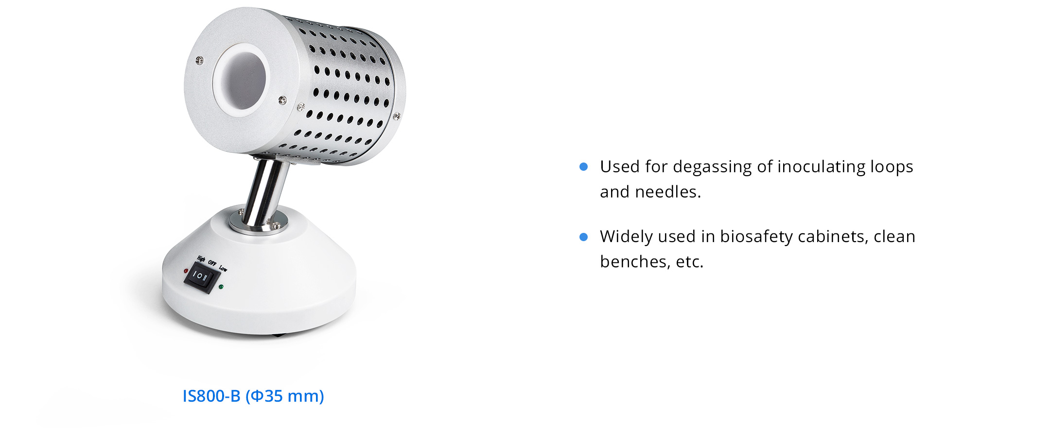 It is applied to the high-temperature sterilization of small items such as inoculation rings and inoculation needles. It completely replaces the alcohol lamp, which is convenient and fast.