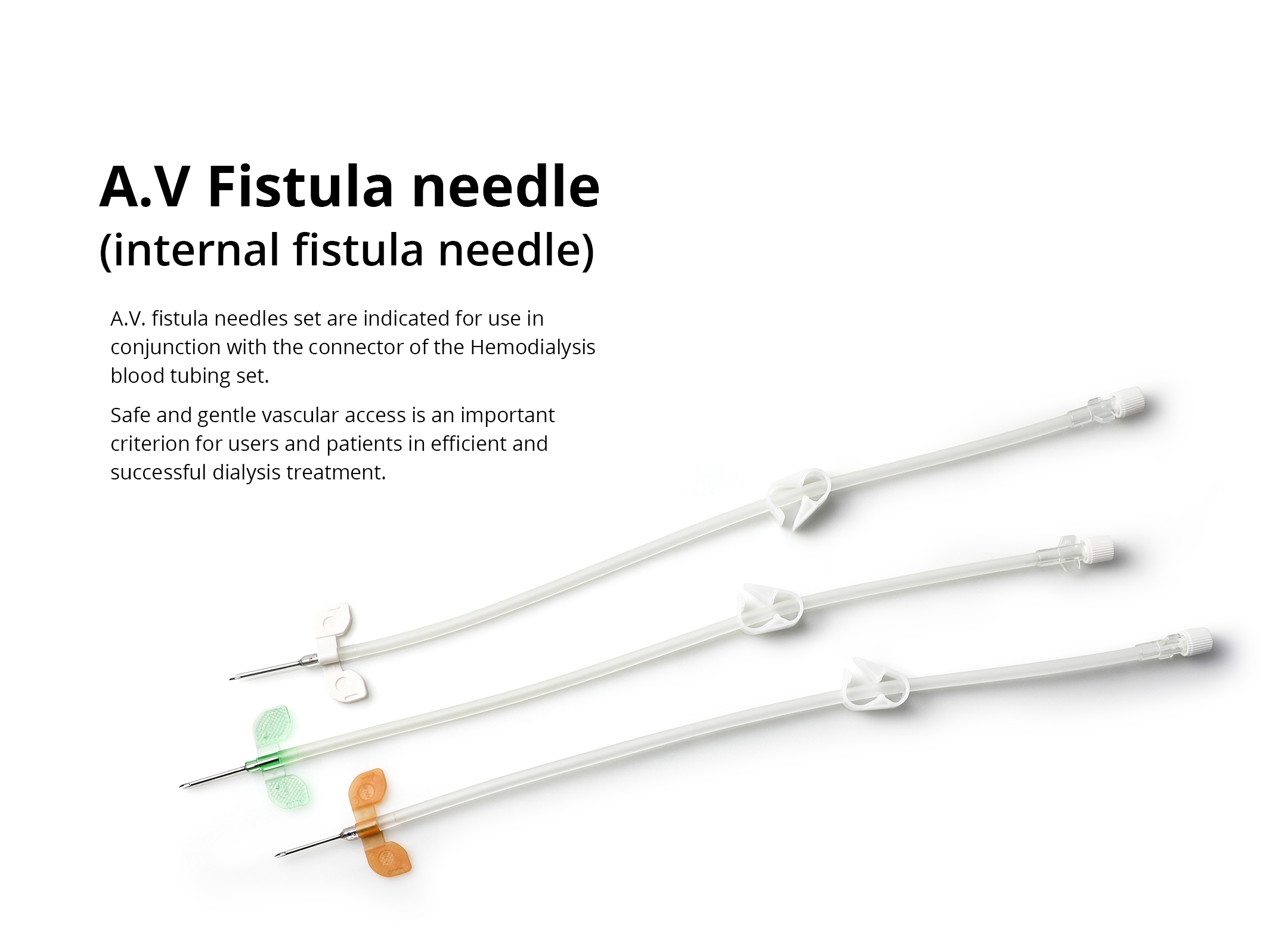 A.V. fistula needles set are indicated for use in conjunction with the connector of the hemodialysis blood tubing set.